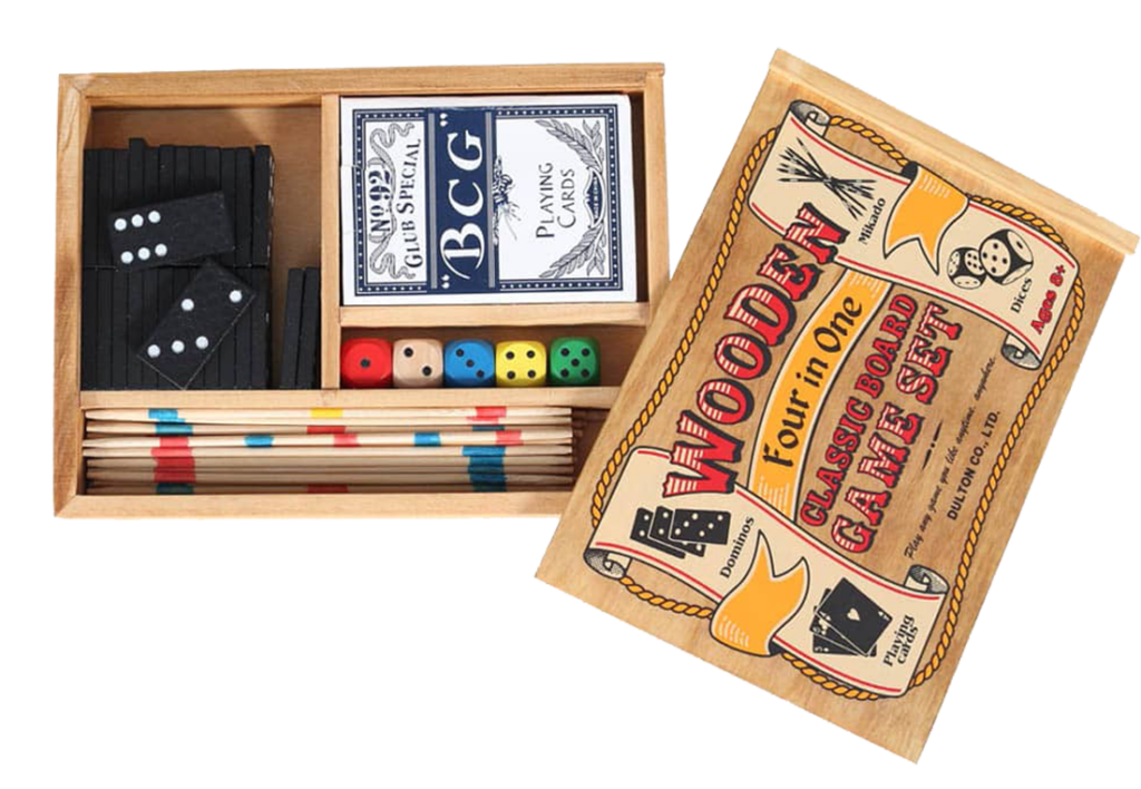 トランプ、サイコロ、ドミノ、ミカドの4種類が入ったゲームセット。